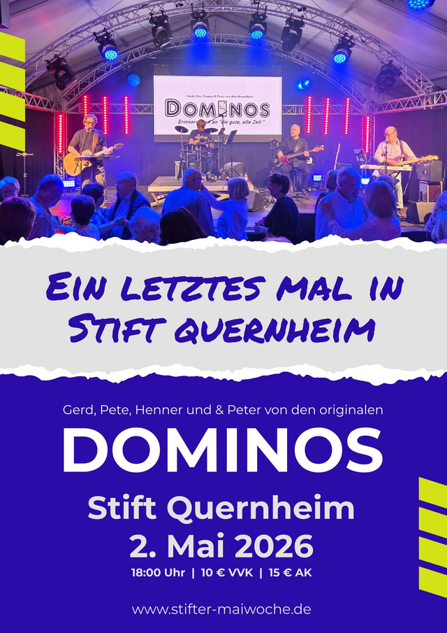 Keine Band ist so eng mit der Stift Quernheimer Maiwoche verbunden, wie die Dominos. Wenn dieser Bandname erklingt, dann fängt die ältere Generation das Träumen an und steht wieder im Festzelt der 70er und 80er Jahre im Kämpersiek.